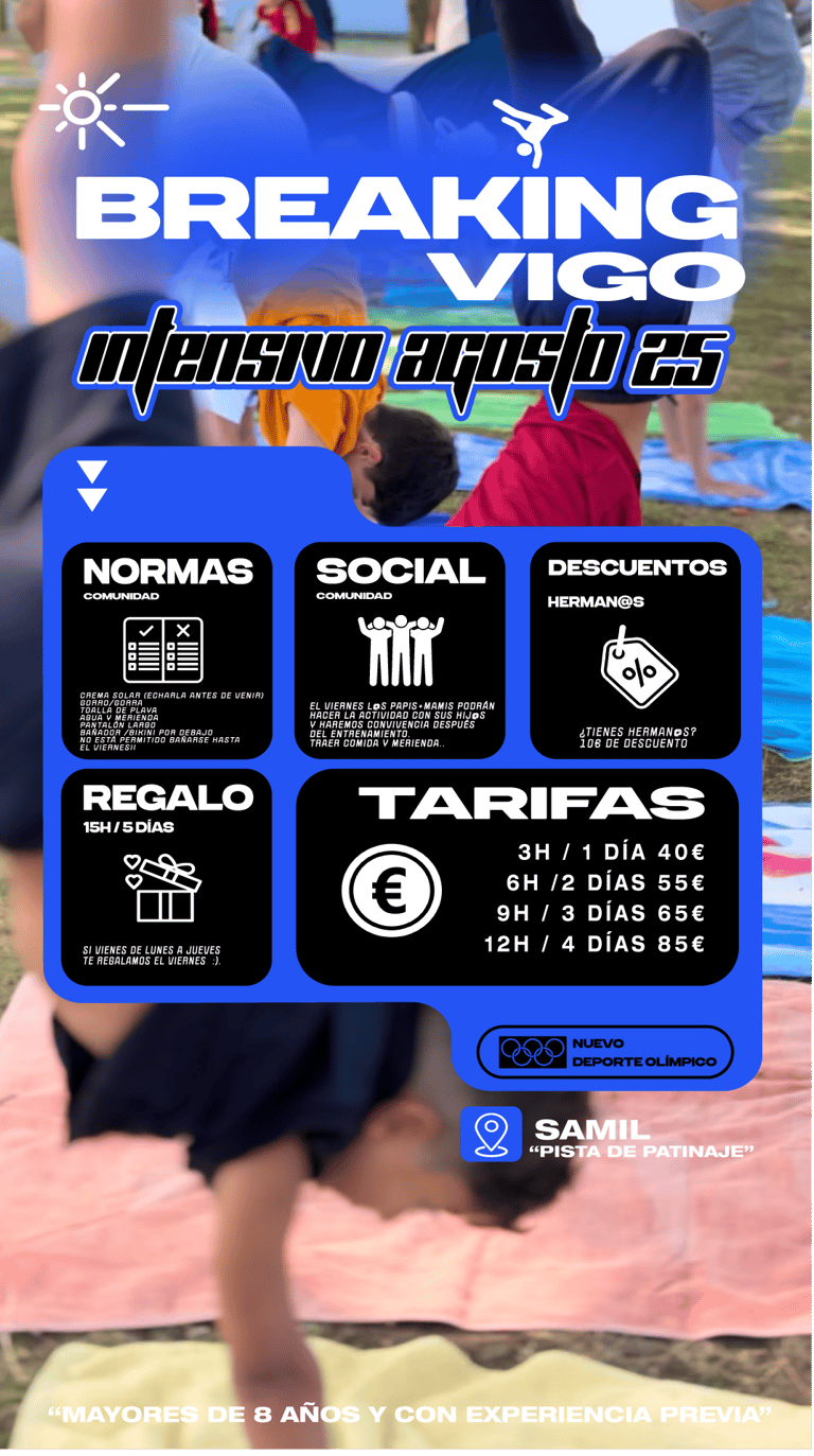 Más de 10 años de experiencia como instructor de breaking en escuelas como DA Vigo y Escuela de danza Mediapunta, así como coreógrafo y bailarin del espectáculo "La Plazuela".